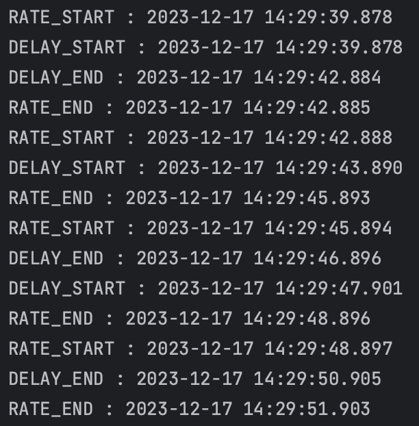 package com.sendbox.asynctest.service; import lombok.extern.slf4j.Slf4j; import org.springframework.scheduling.annotation.Scheduled; import org.springframework.stereotype.Component; import java.time.LocalDateTime; import java.time.format.DateTimeFormatter; @Slf4j @Component public class TestScheduler { @Scheduled(fixedRate = 1000) public void rateScheduler() { log.info("RATE_START : {}", getNowTimeToString()); try { Thread.sleep(500); } catch (InterruptedException e) { throw new RuntimeException(e); } log.info("RATE_END : {}", getNowTimeToString()); } @Scheduled(fixedDelay = 1000) public void delayScheduler() { log.info("DELAY_START : {}", getNowTimeToString()); try { Thread.sleep(500); } catch (InterruptedException e) { throw new RuntimeException(e); } log.info("DELAY_END : {}", getNowTimeToString()); } private String getNowTimeToString() { LocalDateTime currentTime = LocalDateTime.now(); DateTimeFormatter formatter = DateTimeFormatter.ofPattern("yyyy-MM-dd HH:mm:ss.SSS"); return currentTime.format(formatter); } }테스트를 위한 코드는 다음과 같이 작성했다.